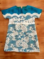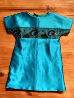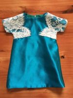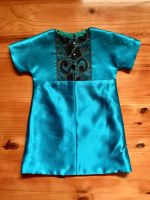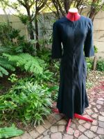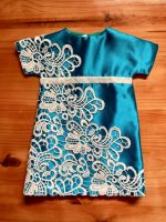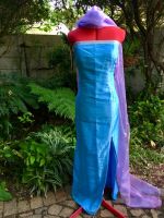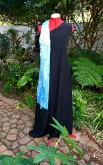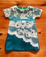 This beautiful aquamarine gown was commissioned for a work function. It is done in Bridal Churmeuse in an A-line design. The Empire waistline is emphasised with embroidered black lace and the skirt has a dramatic amount of flare with a long train trailing behind it.