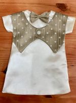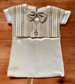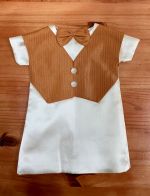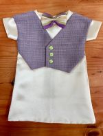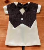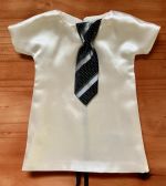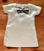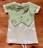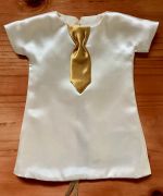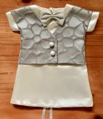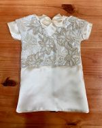 This is definitely one of the more interesting looking wedding gowns we have received. This vintage style gown has a double breasted button closure on the front – a first for us – and it compliments the gown perfectly, along with the lace shawl collar and cuffed sleeves.