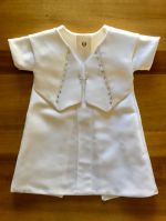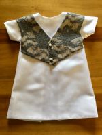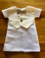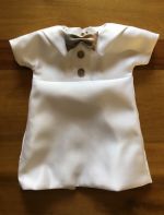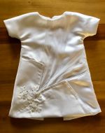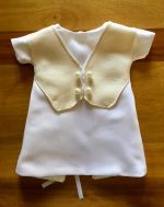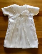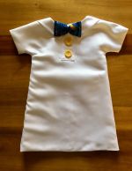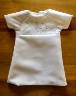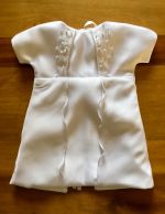 They are both made in white duchess satin and both are A-line style. One is off the shoulder with machine embroidery and a chiffon overlay, while the other has a sweetheart neckline, with bead and duchess satin ruched detail. Between the two a total of 23 Angel Gown® garments were repurposed; 12 x Newborns, 3 x Preemies, 7 x Tinys and 1 x Micro. All are viewable below.